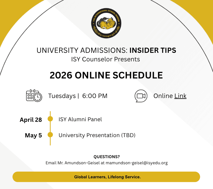 This weekās University Admissions: Insider Tips workshop will be on Tuesday, April 28. Mr. A-G has put together an ISY alumni panel who will focus on four main themes: