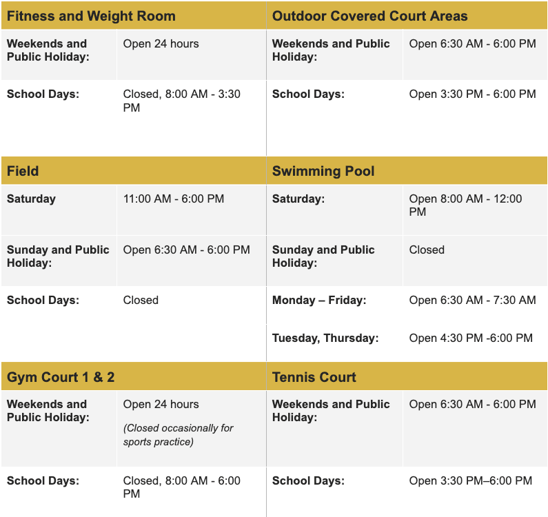 - 🏫 Facilities Schedule: Weekend and Weekday Usage Times