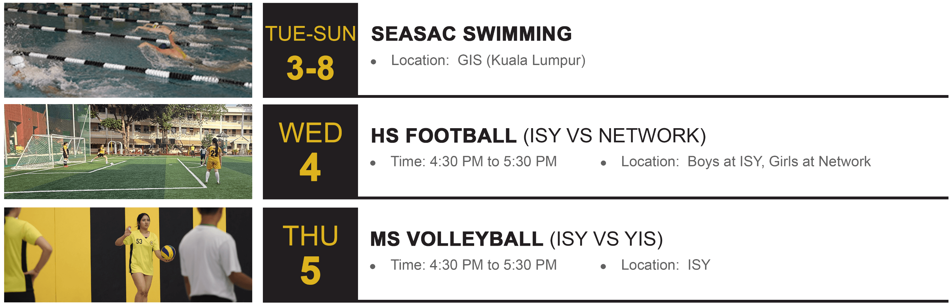 Upcoming Events: Ā Badminton Tournament; SEASAC Swimming, HS Football and MS Volleyball