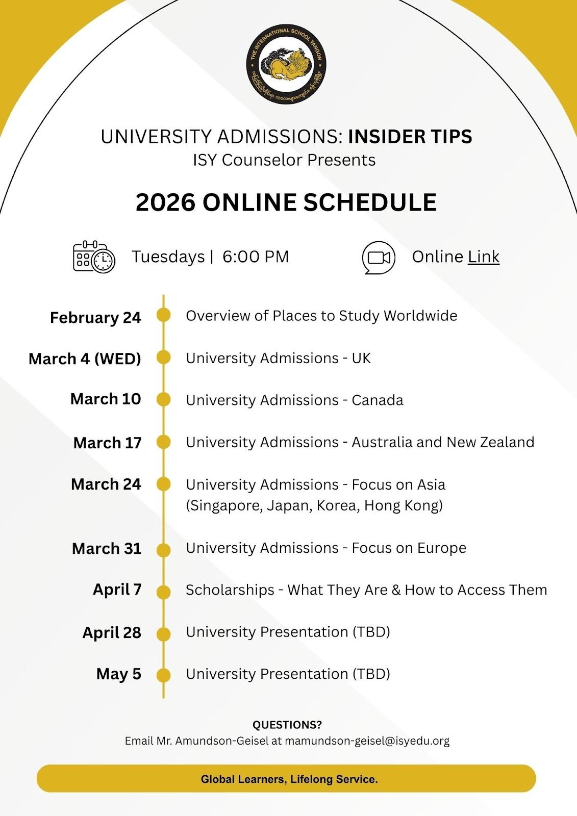 This year’s first University Admissions: Insider Tips workshop will be this Wednesday, March 4. This week’s workshop will focus on the university application process for the United Kingdom. These workshops will be online (see Zoom link above) from 6:00 pm to 7:00 pm. See below for a schedule of upcoming workshops.