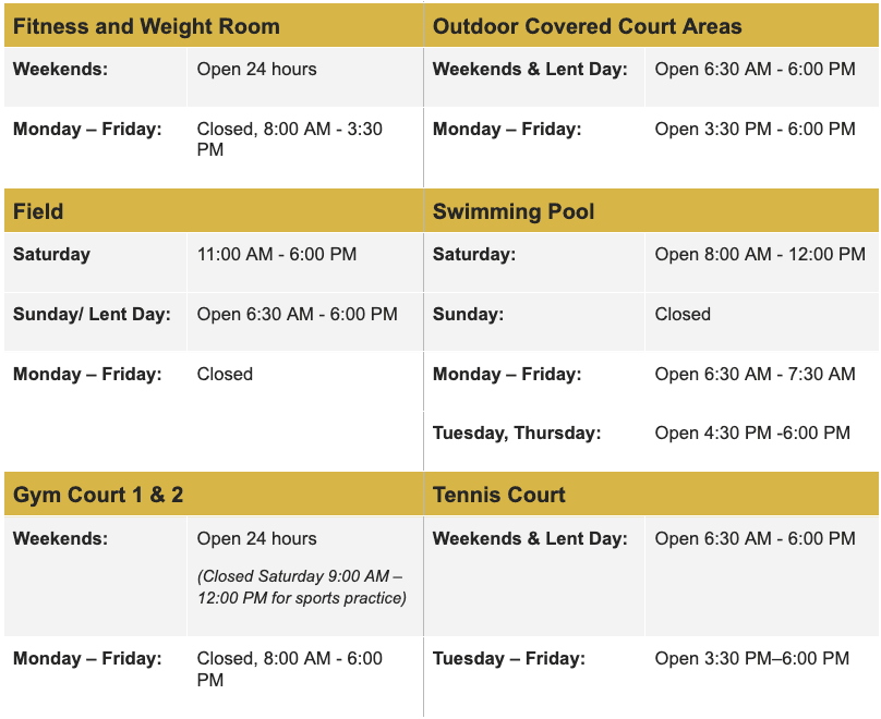- 🏫 Facilities Schedule: Weekend and Weekday Usage Time