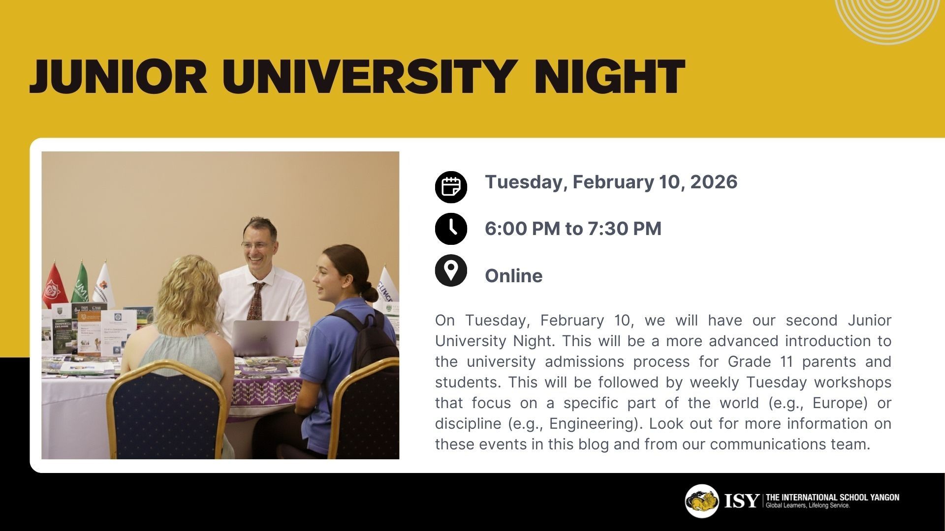 While it is our Juniors (Grade 11 students) who are the ones ready to begin the university admissions process, all ISY students and parents are welcome to attend.