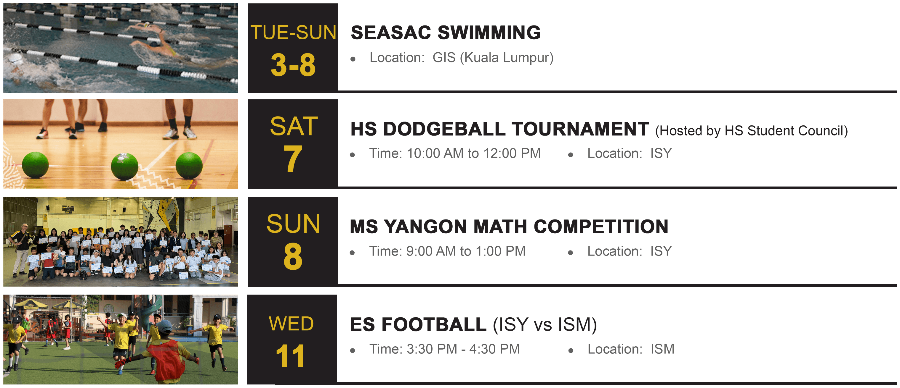- 🎈Community Competition and Intellectual Growth: HS Dodgeball Tournament this Saturday; Middle School scholars compete in the Yangon Math Competition on Sunday.